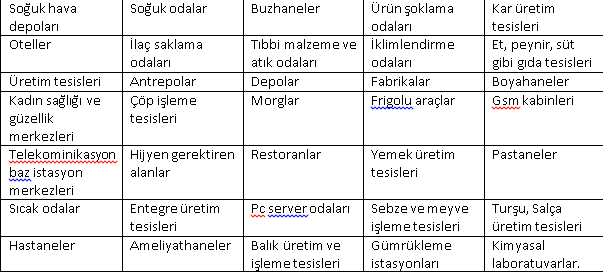 Sürgülü kapıların kullanım alanları aşağıdaki tabloda verilmiştir: